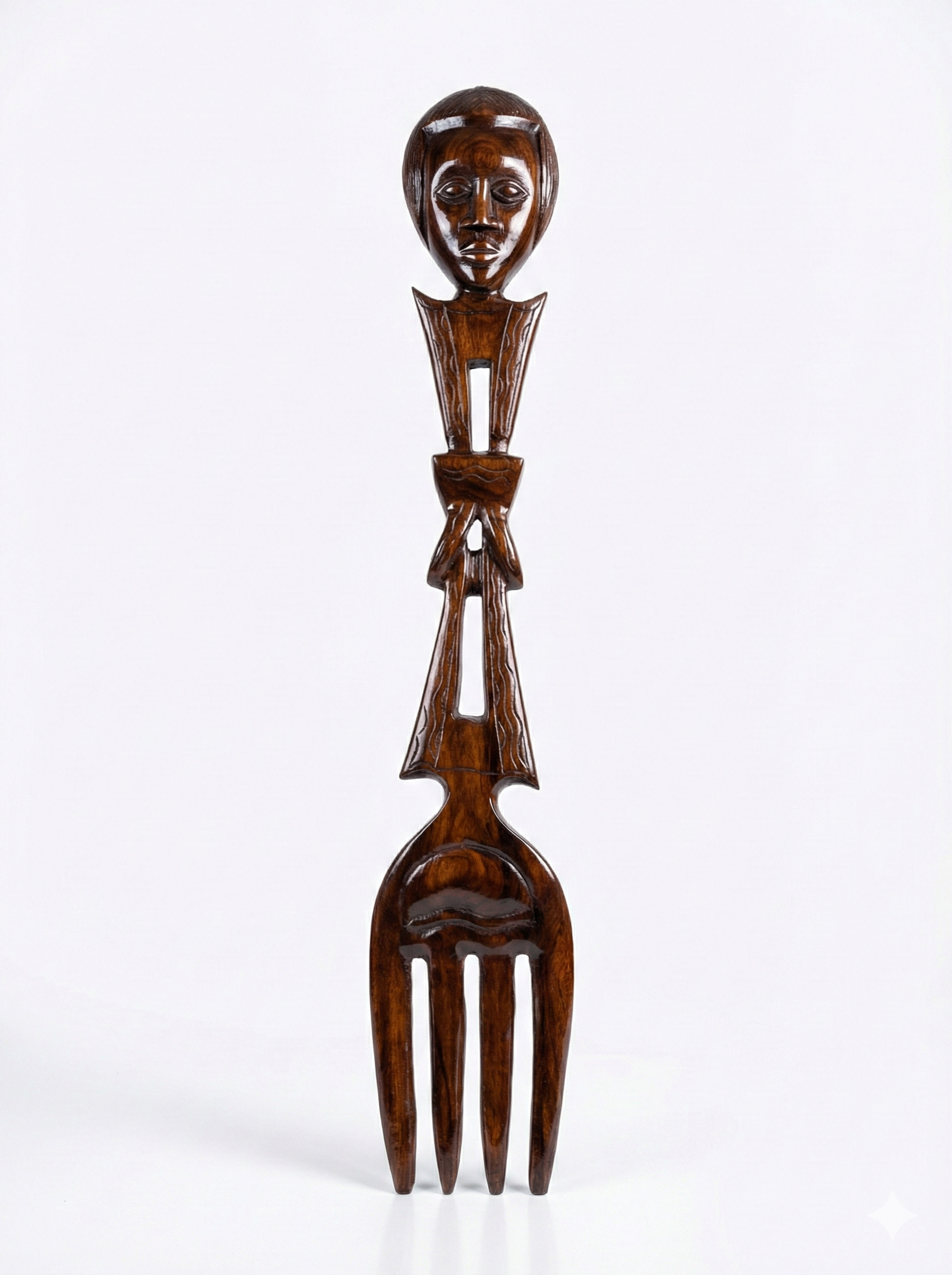 This striking Hand-Carved Decorative Fork is a masterwork of Ghanaian craftsmanship, part of the traditional Sankofa set. Standing at 2 feet tall, the piece features a finely detailed head with a serene expression, symbolizing the wisdom of the ancestors. The handle is expertly turned with geometric relief carvings, finished in a deep, lustrous mahogany-tone patina. While bold enough to stand alone as a sculptural element, it is traditionally paired with a matching spoon to represent hospitality and cultural heritage. Perfect for kitchen galleries, dining rooms, or as a unique gift for collectors of African woodwork.