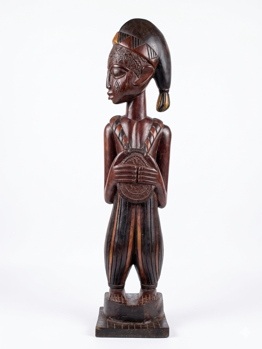 This striking, hand-carved mahogany-finish wooden sculpture captures the essence of West African artistry. The figure features intricate tribal scarification on the face and a highly detailed traditional headpiece. It depicts a stylized male figure holding a ceremonial shield or percussion instrument, adorned with vertical striped patterns on the lower garments. Each curve and etch showcases the artisan’s skill, making it a powerful statement piece for collectors of global folk art or those looking to add a soulful, rhythmic energy to their interior decor.