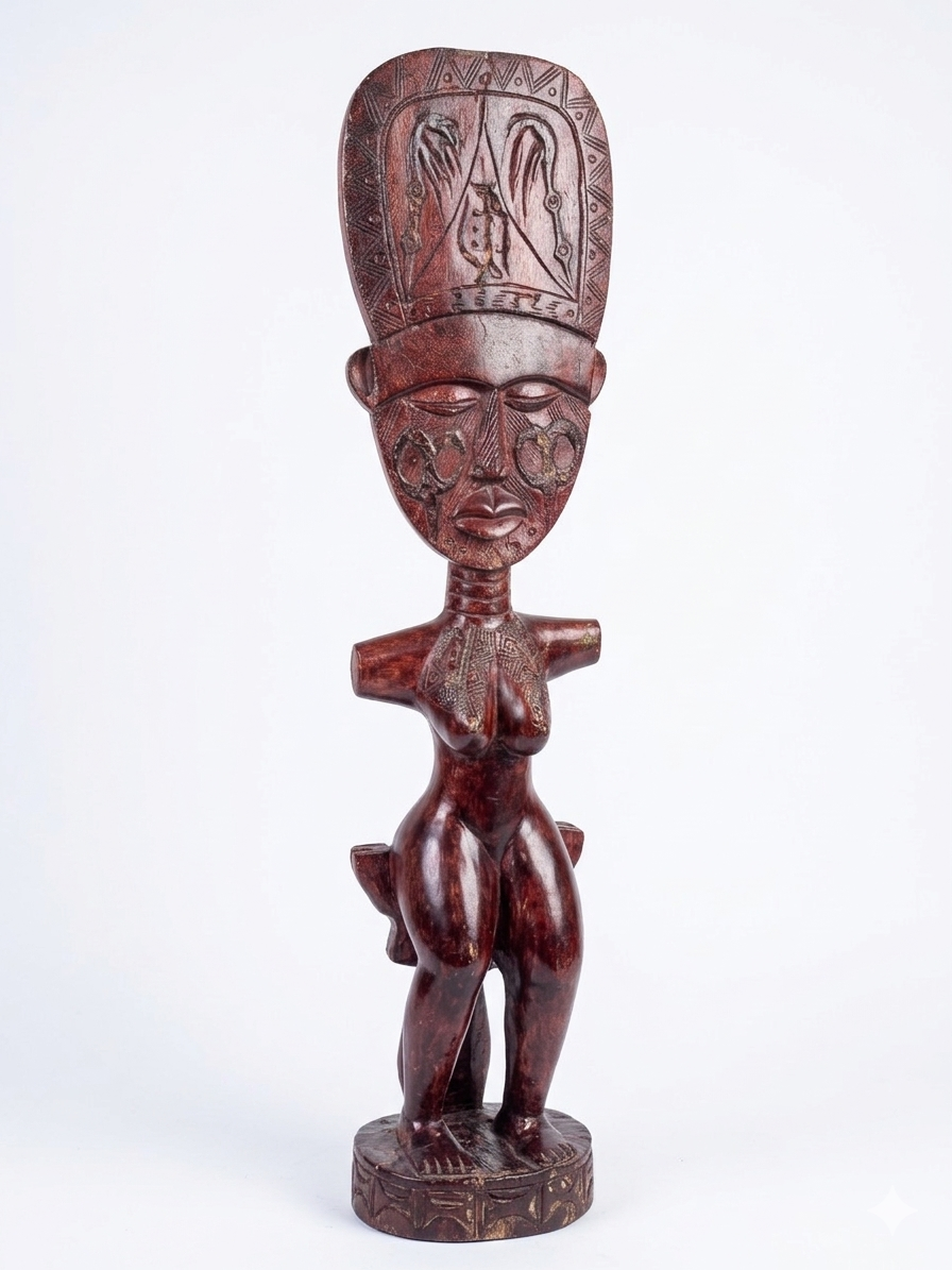 This striking hardwood sculpture features a seated female figure, distinguished by an expansive, vertically oriented headdress intricately carved with symbolic bird motifs and geometric borders. The face is adorned with detailed scarification patterns on the cheeks and forehead, representing high social standing and beauty. With a rich, reddish-brown mahogany finish and an elongated, ringed neck, this piece exhibits classical Asante-inspired aesthetics. The figure is integrated into a circular, etched base, making it a sturdy and culturally rich addition to any collection.
