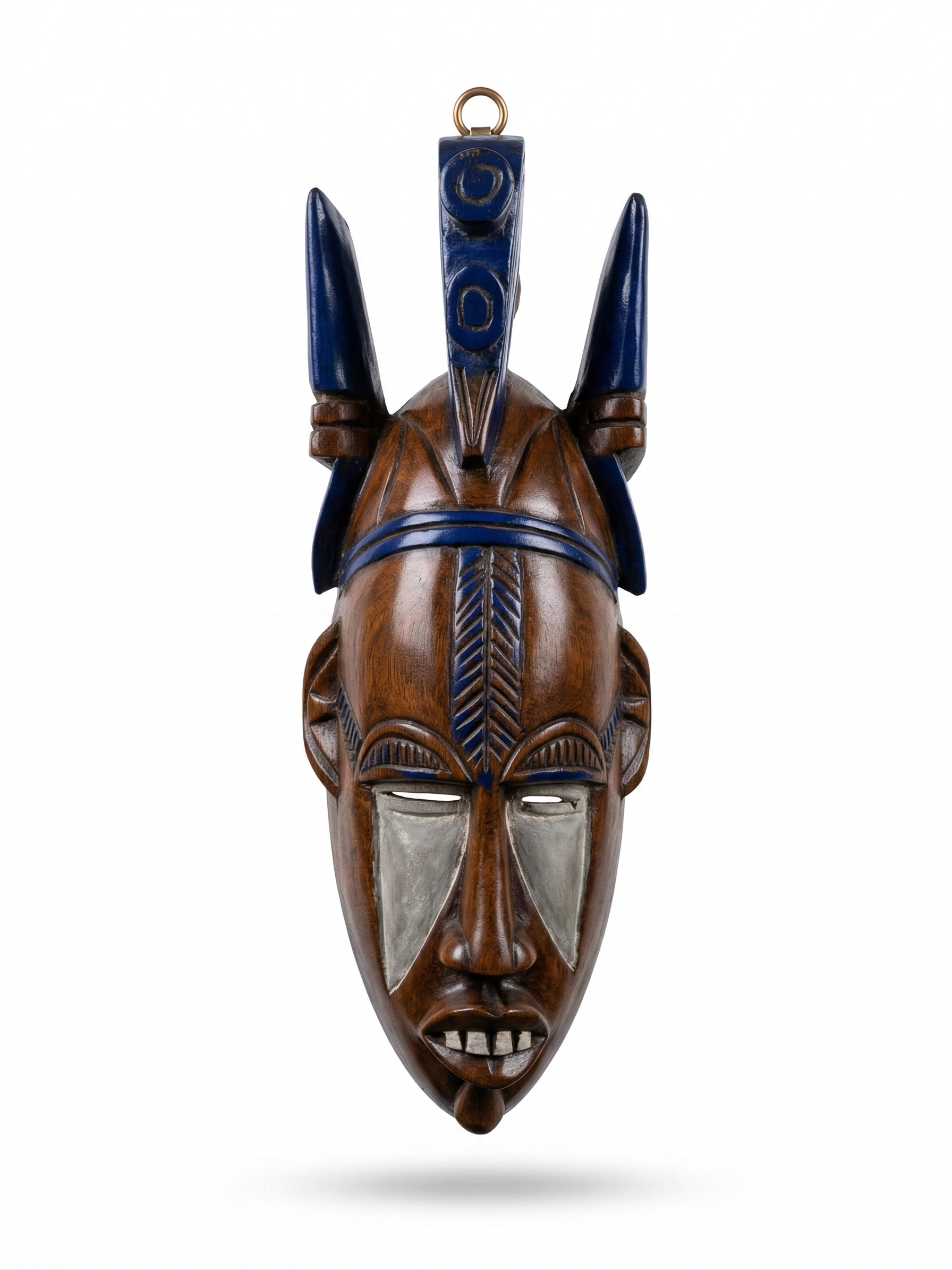 This captivating hand-carved wooden mask features a dynamic design crowned with three prominent horns. The warm, polished wood grain is beautifully contrasted by striking accents of deep blue pigment along the crests, forehead band, and central nasal ridge. Crisp white pigment highlights the deeply set eyes and the prominently carved teeth, creating a dramatic and highly expressive face. Intricate linear scarification details adorn the forehead and eyebrows, adding texture and depth to the artisanship. Complete with a brass loop for easy wall mounting, this mask is a bold statement piece for any collection.
