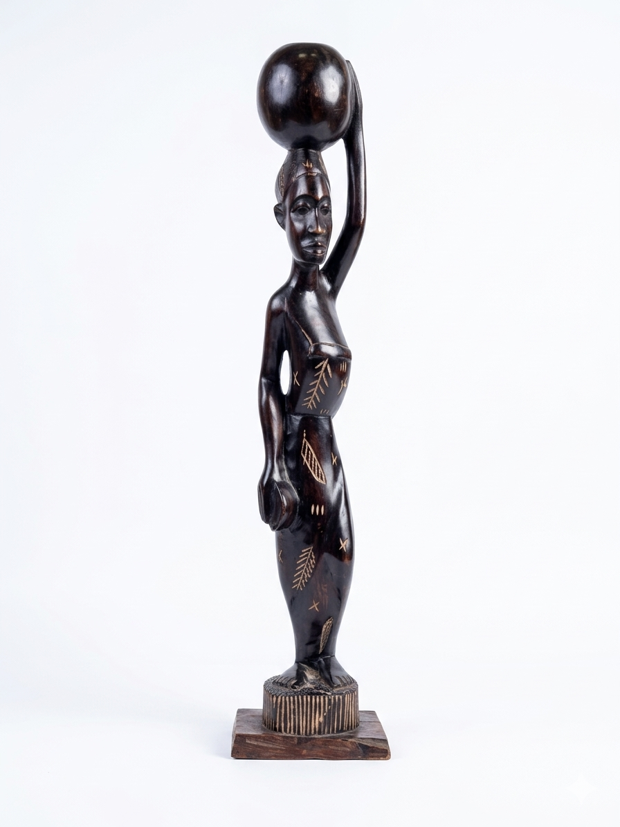 This beautifully carved statue depicts a woman in a moment of poised movement, expertly balancing a spherical vessel on her head. The sculpture features a slender, flowing form with a rich mahogany-toned polish that catches the light along its smooth curves. Delicate, hand-etched tribal motifs adorn her garments, providing a textured contrast to the high-gloss finish of the wood. Rising from a sturdy, patterned base, this piece embodies the strength and elegance of traditional West African life, making it a sophisticated addition to any art collection or interior space.