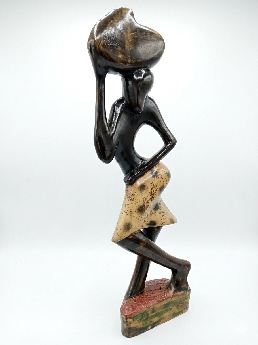 Add a touch of contemporary African flair to your decor with this “Shadow” series sculpture. Standing at 1.6 feet, this piece features a unique, leaning silhouette that captures the rhythmic movement of a woman carrying a market basket. The striking contrast between the deep, polished ebony finish and the textured, lighter-toned skirt creates a bold visual statement. Hand-carved with minimalist elegance, it is a perfect accent for modern bookshelves, side tables, or as part of a curated African art gallery.